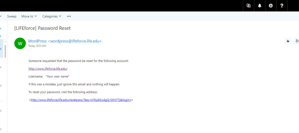 Check for an email from wordpress@lifeforce.life.edu. It will contain a link and instruction on how to proceed. If you do not find the email, check your spam folder. See image above.